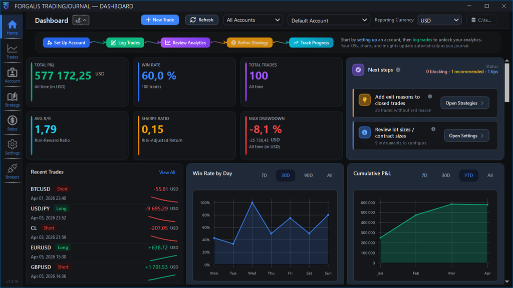 Capture, tag, and review every trade in seconds. Your data stays on your machine with simple exports when you need them.